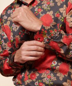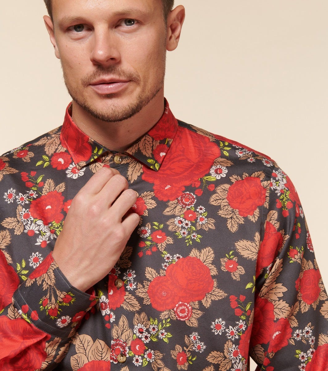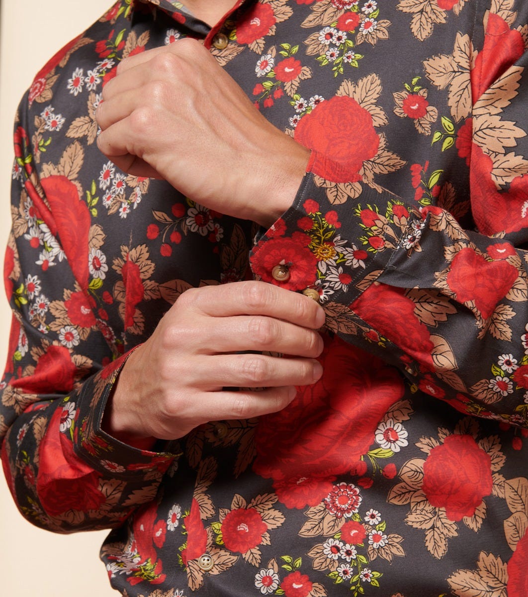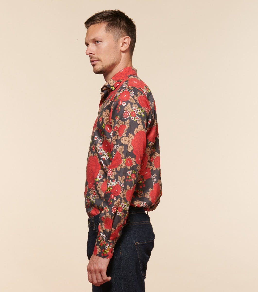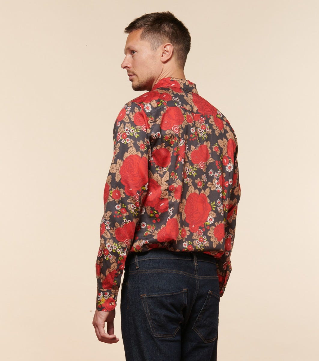 - In flowing cotton sateen, printed with our “Roulotte” motif in anthracite red.