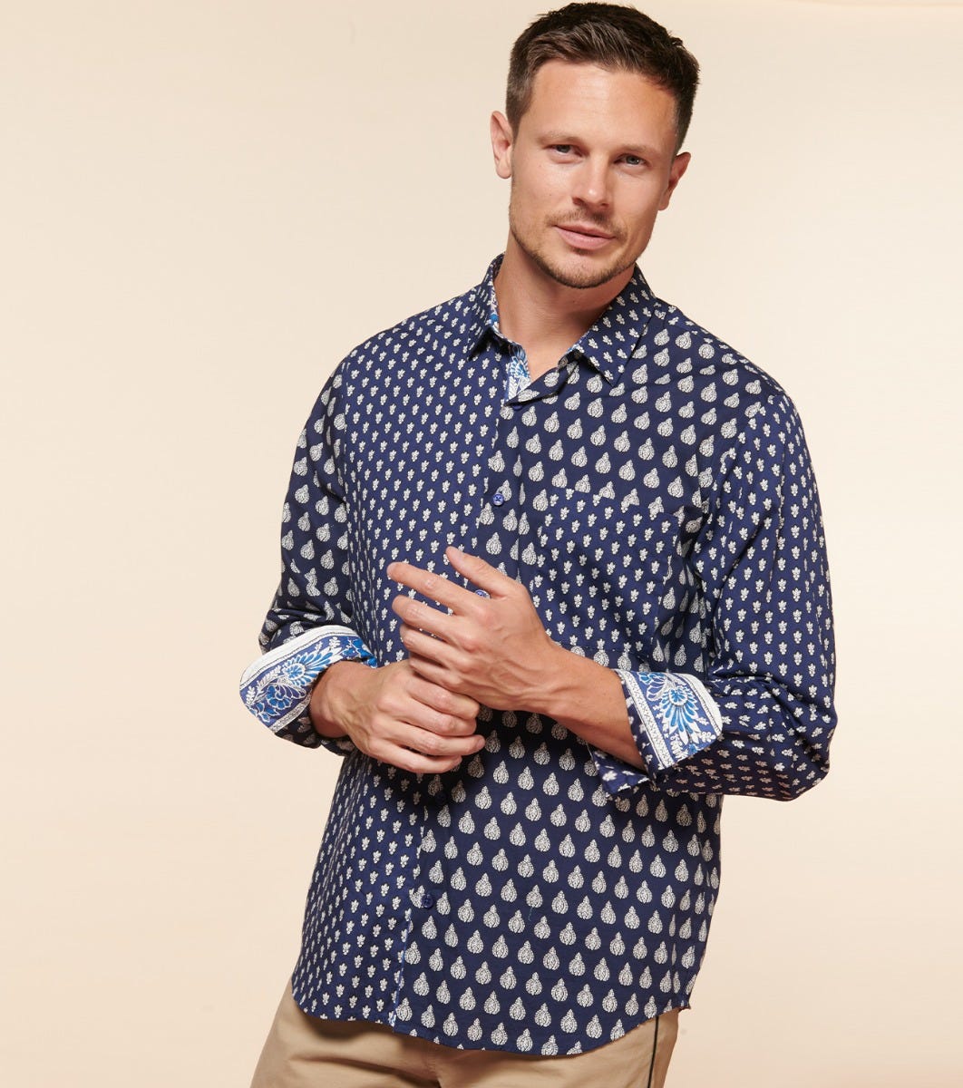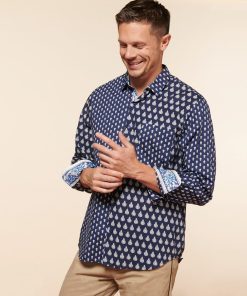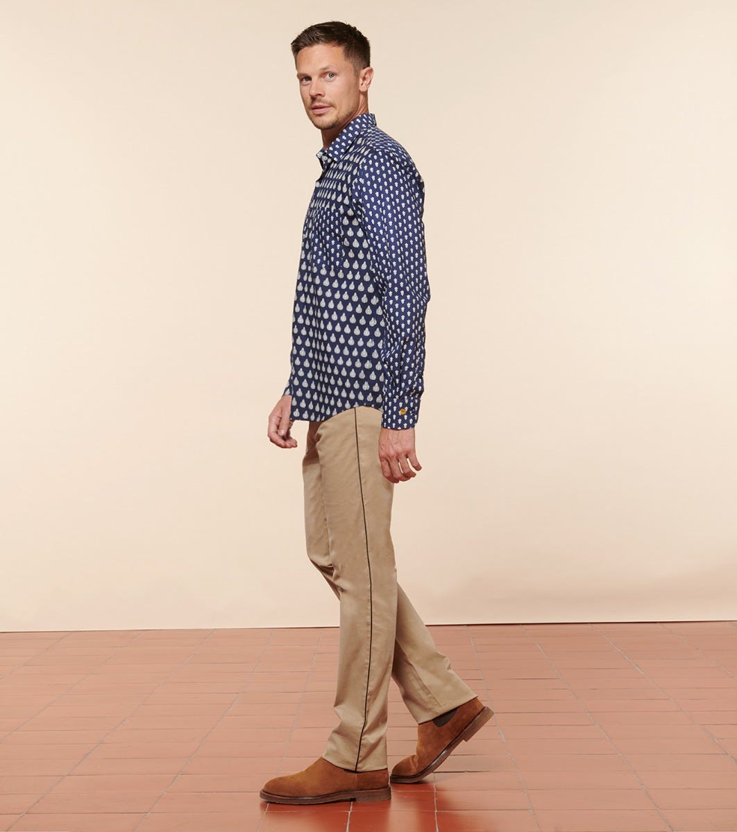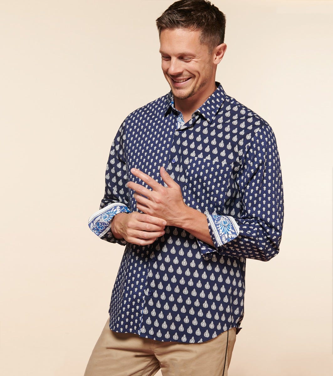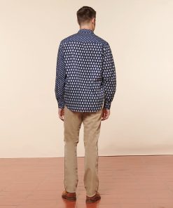 - Le Petit Artichaud marine” printed frieze detail on inside contrast at collar stand, under collar and inside cuff