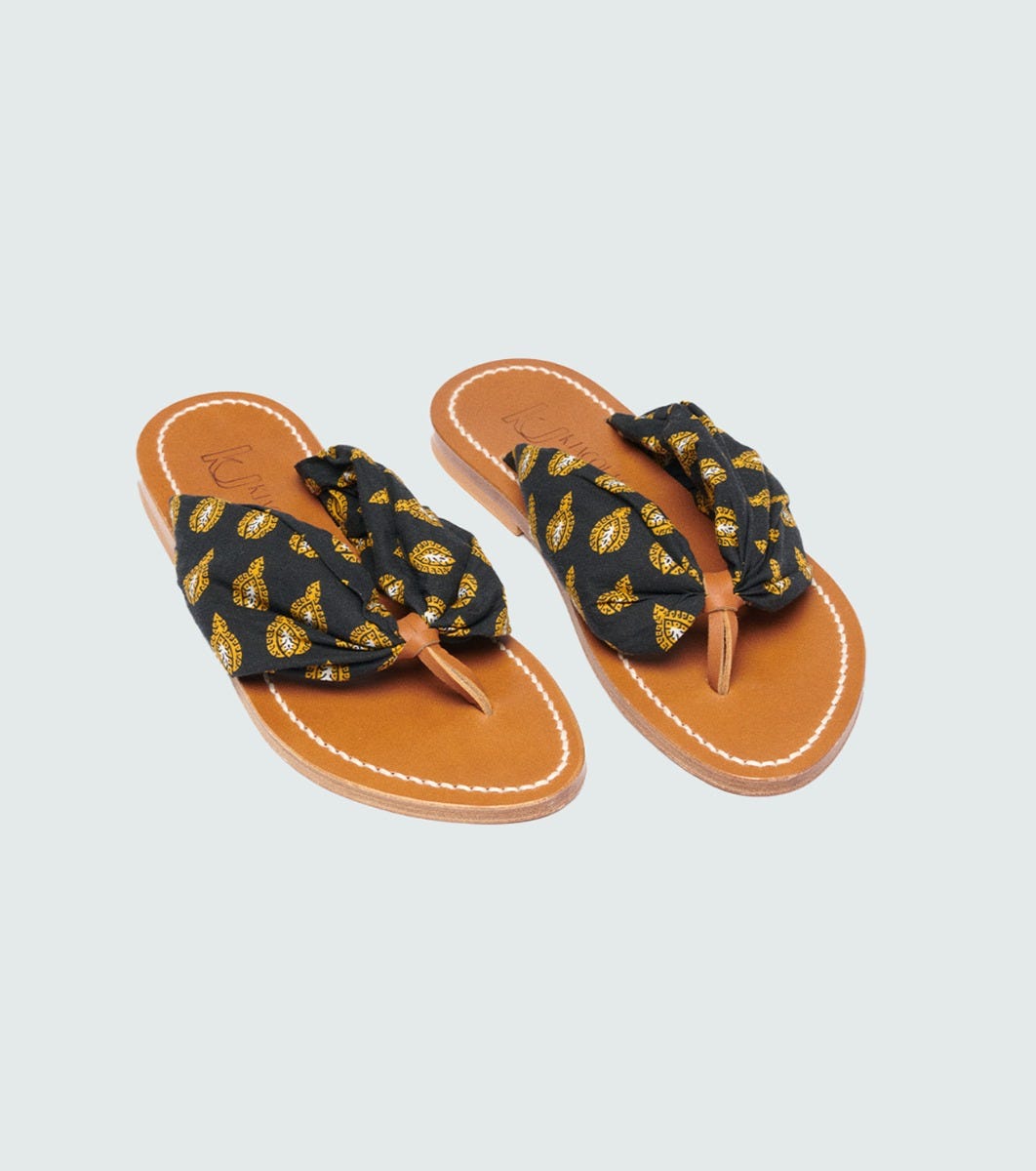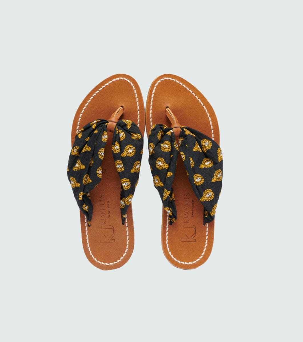- Elegant and comfortable, the Sabayon model in collaboration with K.Jacques features an instep strap in Souleiado printed fabric, with a leather loop at the front to ensure good foot support.