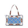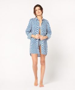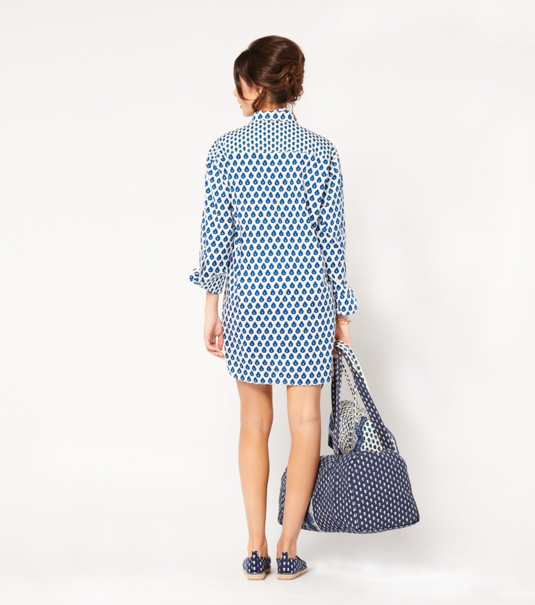 - En batiste de coton imprimé en jeu de patch avec nos motifs iconiques “La Mouche” et “Indiana” coloris blanc bleu