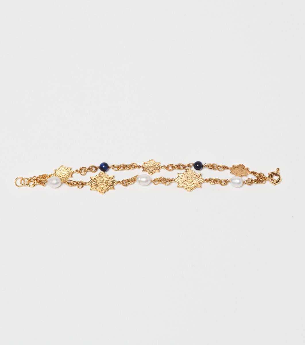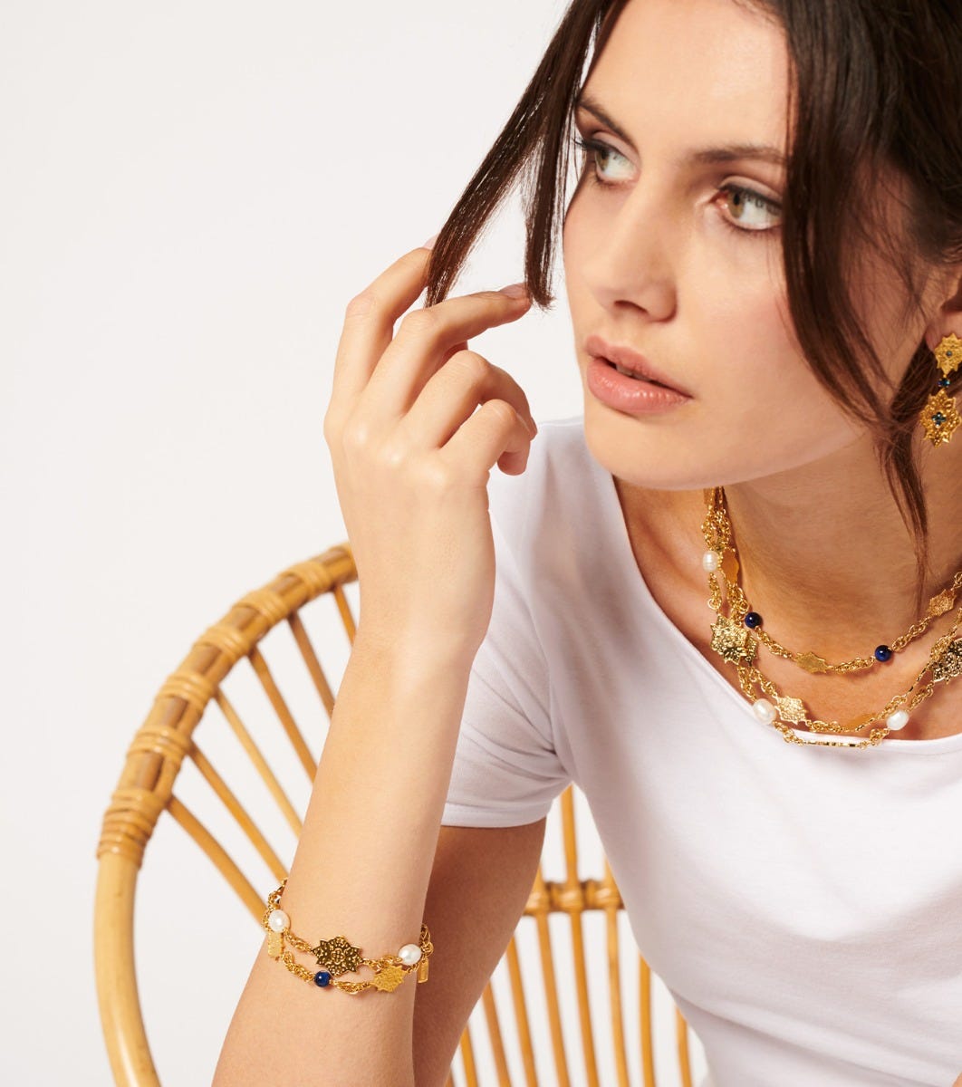 - Fine gold-plated brass bracelet, assembled with 2 rows of chains and adorned with our iconic Merveille motif.