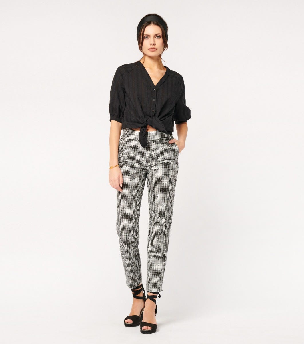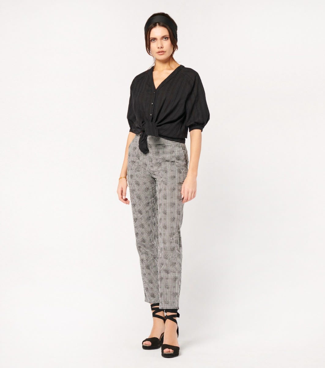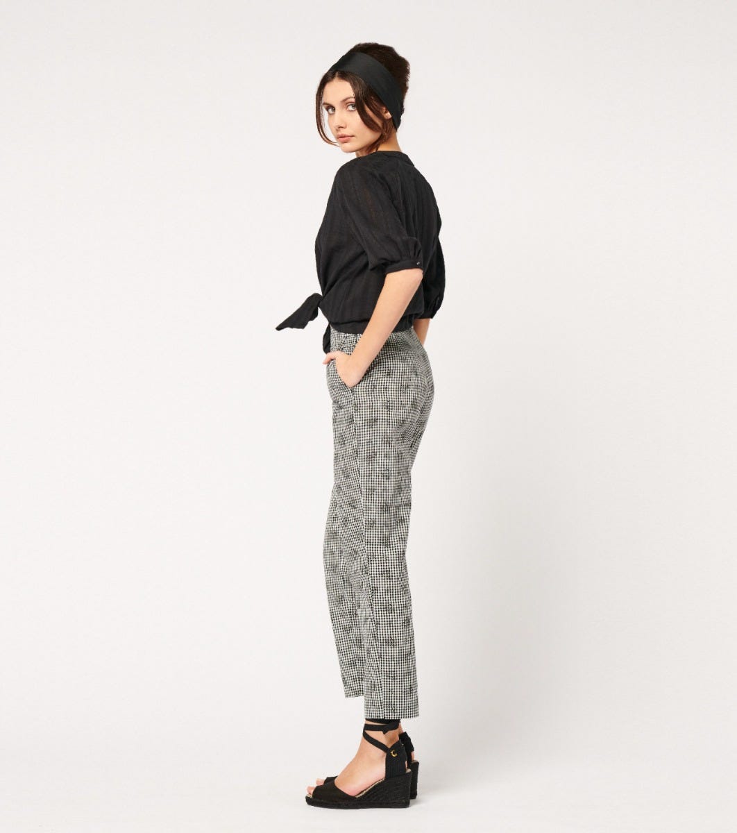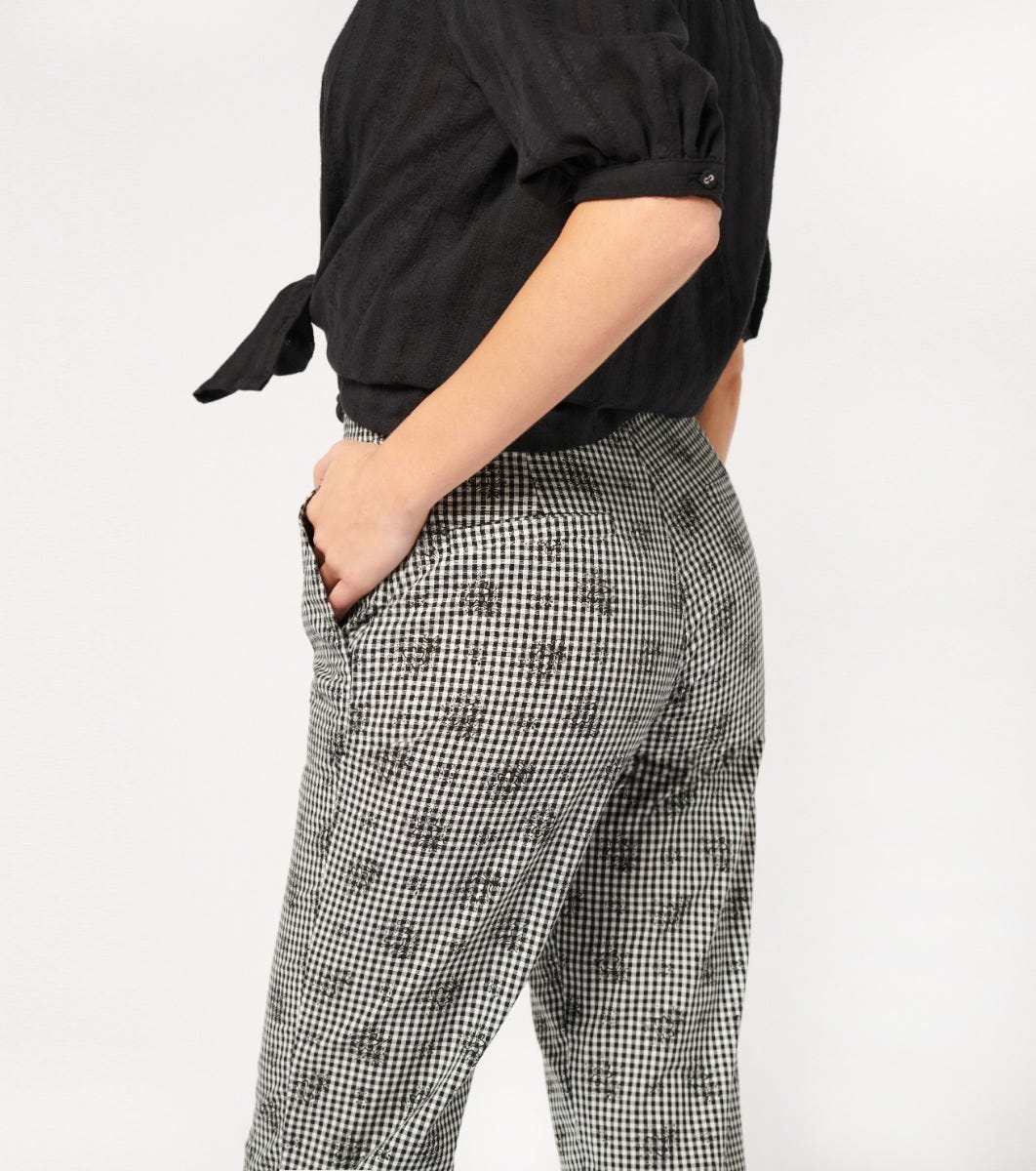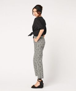 - Adopt a look that’s both timeless and daring with these capri pants in black and white overprint gingham. Perfect for a chic look, they feature a straight, structured cut. A must-have for any outfit.
