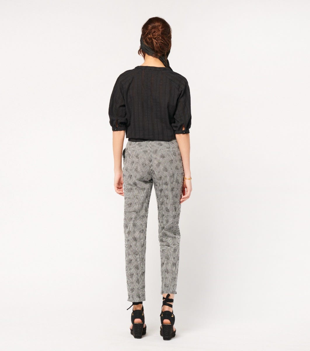 - Cotton bastite in gingham jacquard overprinted with our “Ixia” motif in black